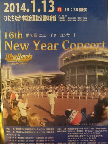 2014年1月13日(祝・月) 第16回ニューイヤーコンサート 場所:ひたちなか市総合運動公園体育館 開演:午後1時30分 前売券:一般¥2000 学生¥1000 当日券:一般¥2500 学生¥1500問い合わせ先:大洗高校音楽棟 ℡029−267−…