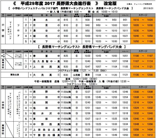 10月1日(日) 長野県マーチングコンテスト・長野県マーチングバンド大会 場所:佐久市総合体育館入場料 【当日券】小中学生900円 高校生以上1000円 【前売券】小中学生800円 高校生以上 900円 1回目大洗高校招待演奏:午前11時30分〜…