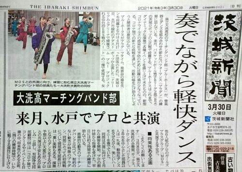 おはようございます 今日の茨城新聞朝刊に大洗高校マーチングバンド部の活動が掲載されました♪ なお、掲載記事にある「ブラダン」の演奏は来月アダストリアみとアリーナで開催される、茨城ロボッツの公式戦ハーフタイムで演奏披露させて頂く予定です♪ 4月1…